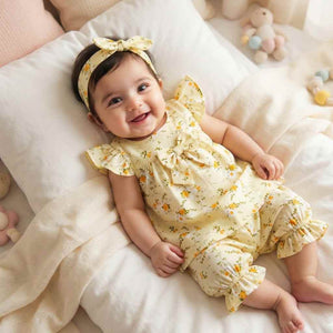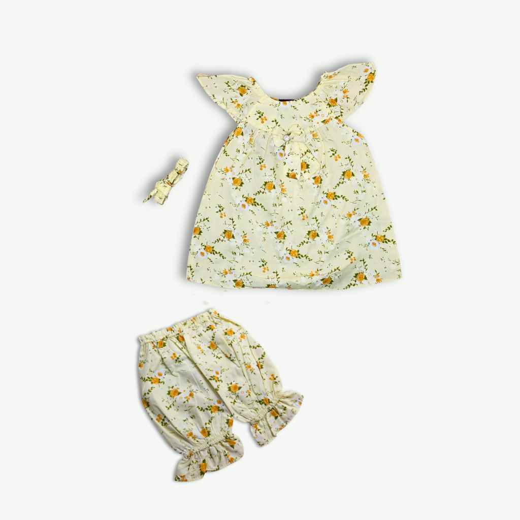 Introduce your little one to timeless elegance with this charming three-piece baby girl set. The soft yellow floral frock features delicate botanical prints that complement fair and warm skin tones beautifully. Crafted from breathable, gentle fabric, it ensures comfort during extended wear. The coordinating headband adds a polished finishing touch, perfect for special occasions, family gatherings, or everyday styling. This complete ensemble eliminates mix-and-match guesswork, offering parents a cohesive, ready-to-wear solution that keeps babies looking picture-perfect while prioritizing their comfort and well-being.