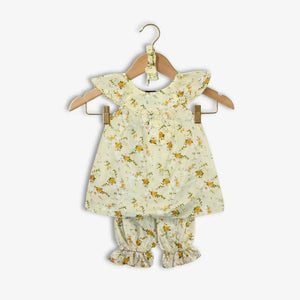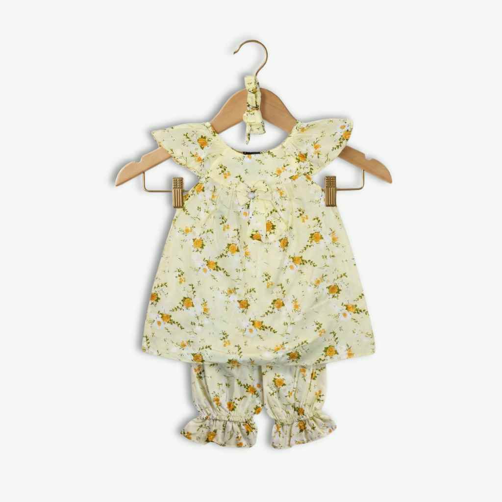 Baby Girl Yellow Floral Frock Set with Headband – 3PCS